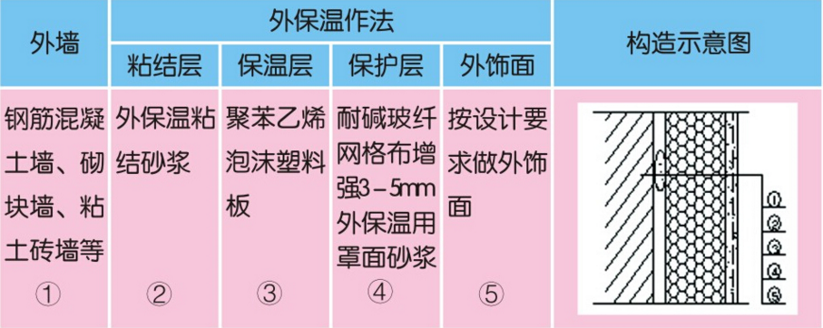本規程是以聚苯乙烯泡沫塑料為保溫材料,耐堿玻纖網格布為增強材料,外墻外保溫專用粘接砂漿和外墻外保溫專用罩面砂漿作面層的建筑外墻外保溫體系的施工標準和驗收標準。該外墻外保溫體系基本構造見表1: