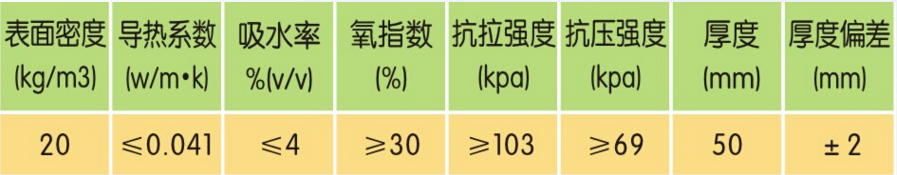 規格為1200mm×600mm×50mm,平頭式,阻燃型,表觀密度28~35kg/m3,尺寸收縮率小于1.5%,吸水率小于1.5%。